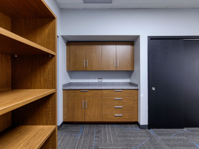 The entire two-floor office renovation took place while the building remained fully occupied, which meant the team was working, meeting, and supporting customers throughout the construction process. To keep their day-to-day operations running smoothly, CJ & Associates created a short-term workspace so employees could continue working while their primary area is being renovated. This area was used during all four phases of the project.